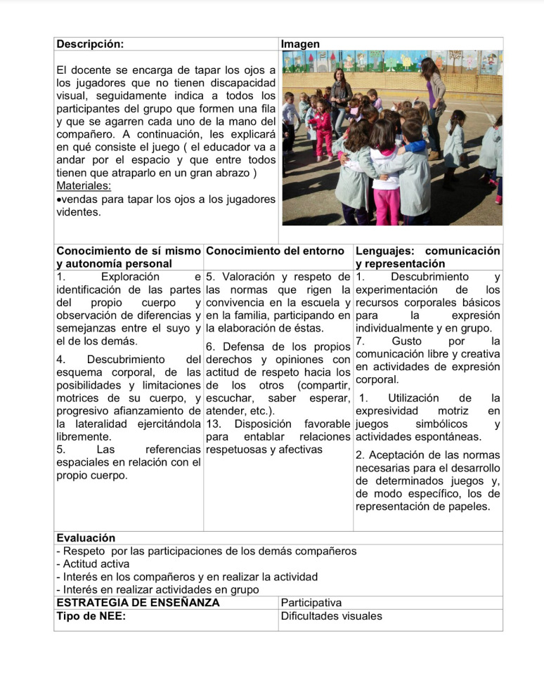 A la hora del juego el docente se encarga de tapar los ojos a los jugadores que no tienen discapacidad visual, seguidamente indica a todos los participantes del grupo que formen una fila y que se agarren cada uno de la mano del compañero.
